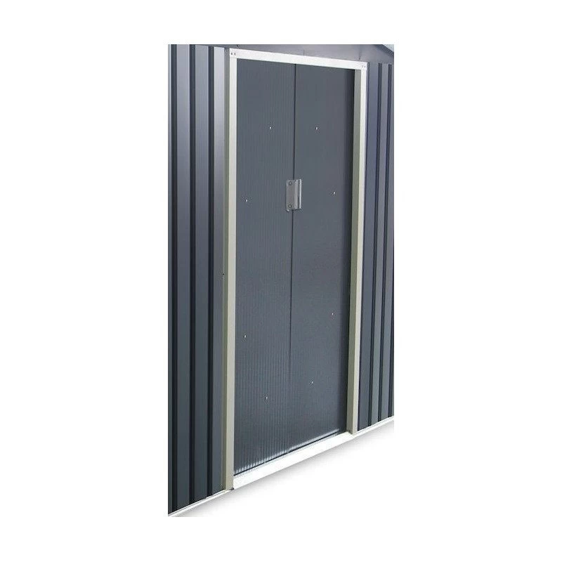 Cuenta con paneles laterales nervados, puerta corredera doble, tejado a dos aguas y claraboya. No incluye suelo.