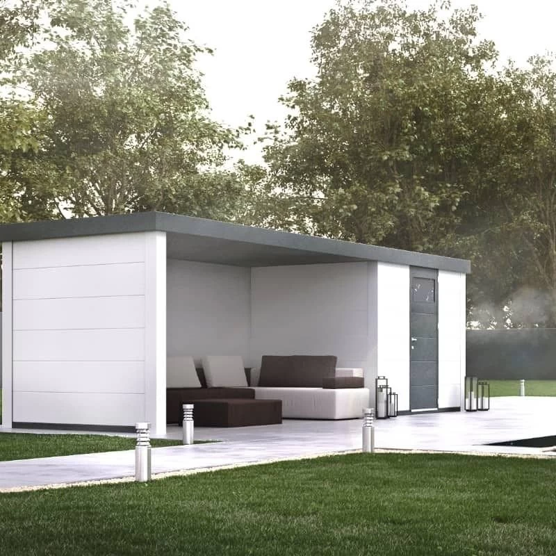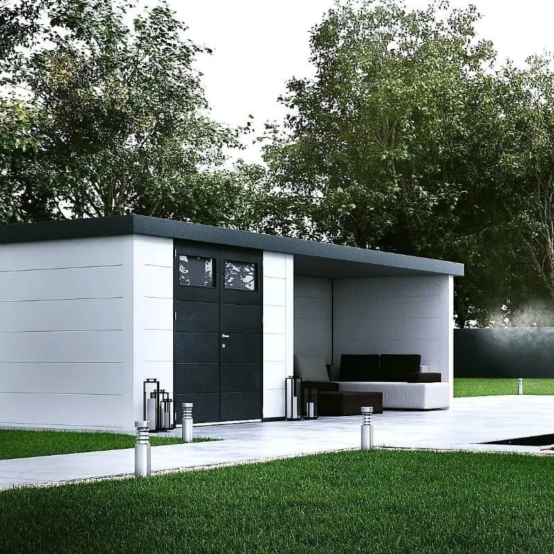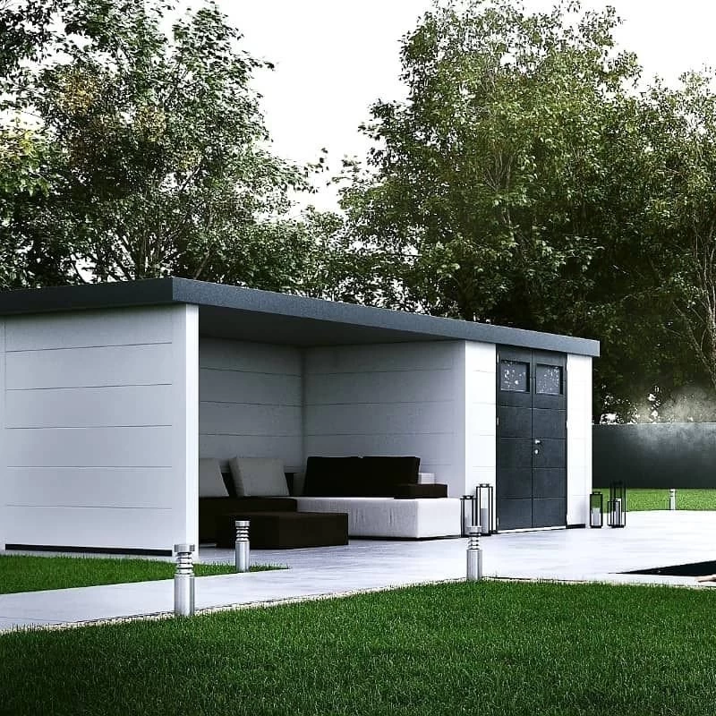 Diseñada como una caseta de jardín con un área cerrada y otra abierta. La presencia de ventanas puede agregar luz natural al interior y mejorar la estética.