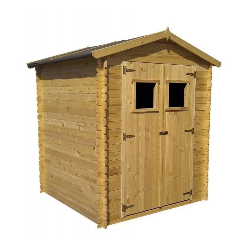 Este modelo de caseta de madera dispone de tejado a dos aguas y puerta doble, además de varias ventanas.