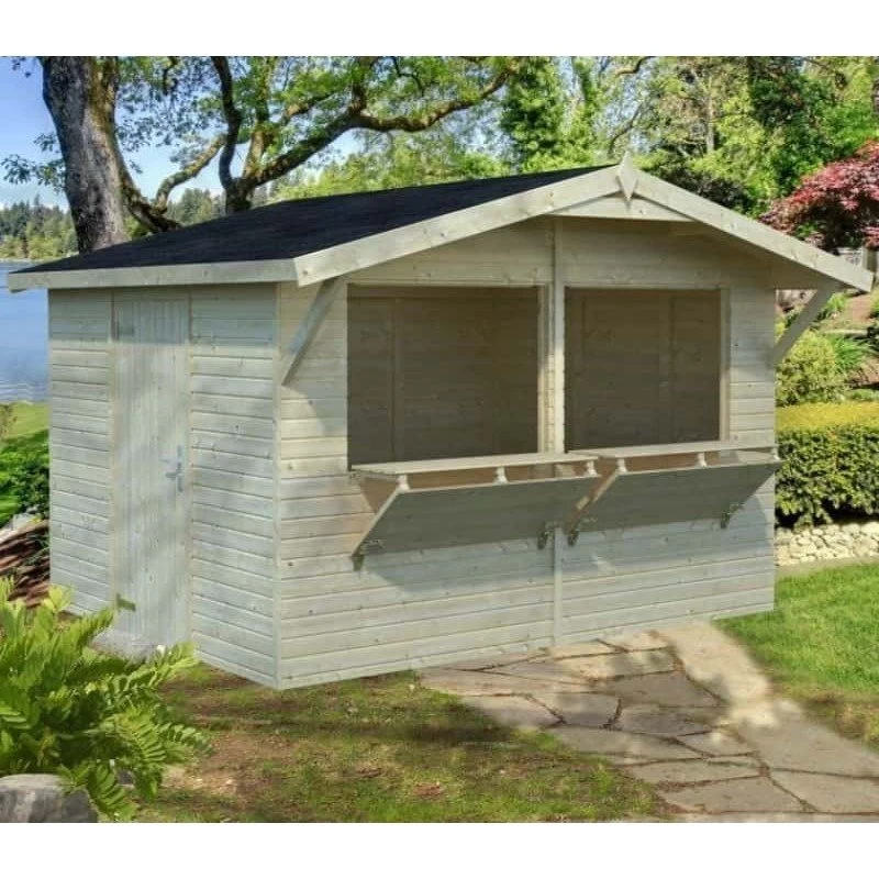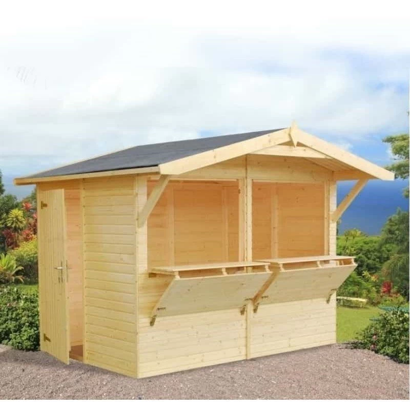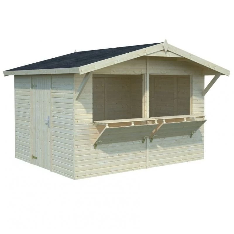 Los kioscos de madera desmontables STELLA fabricados en abeto nórdico de 16 y mm de grosor. Ideales para utilizar en ferias móviles o chiringuitos, posibilidad de aplicar tratamiento interior ignifugo certificado, fácil montaje y desmontaje.