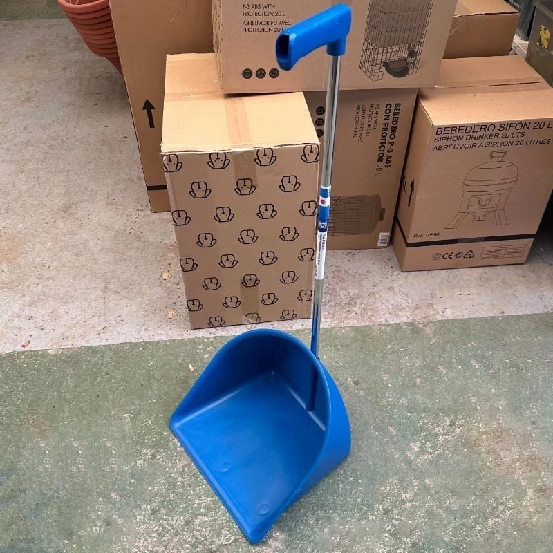 Recogedor de jardín fabricado en resistente plástico azul de alta durabilidad, con dimensiones de 35x30x24 cm. Incluye un mango metálico de acero inoxidable de10x90 cm, combinado con un mango ergonómico de plástico duro en tono azul y que ofrece un conjunto robusto y fácil de usar.